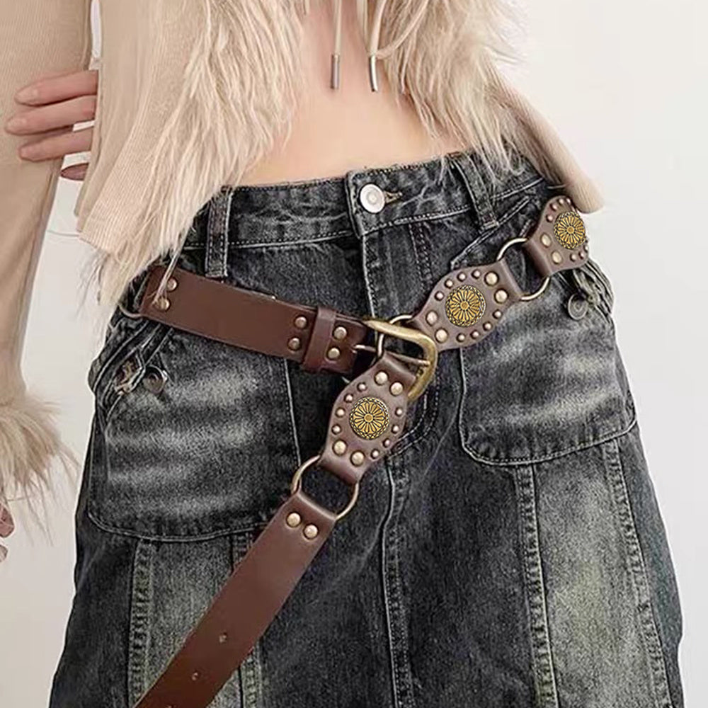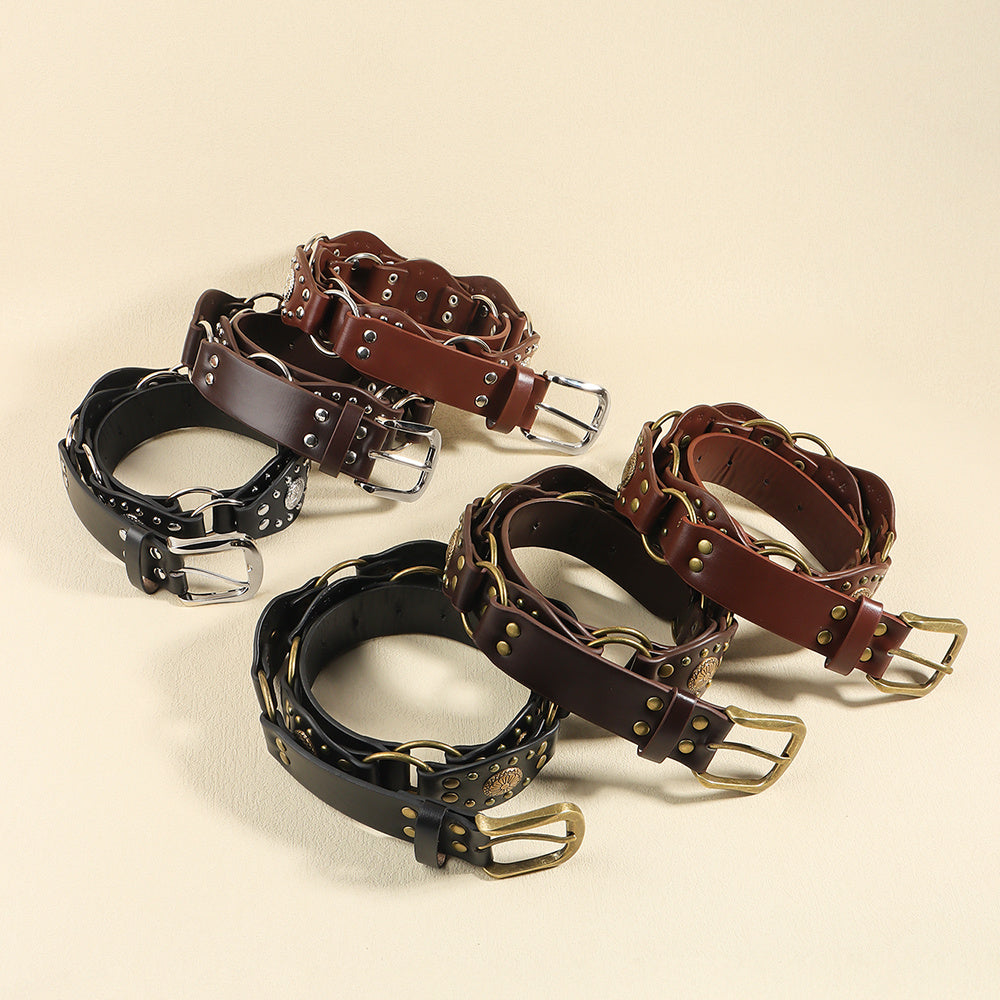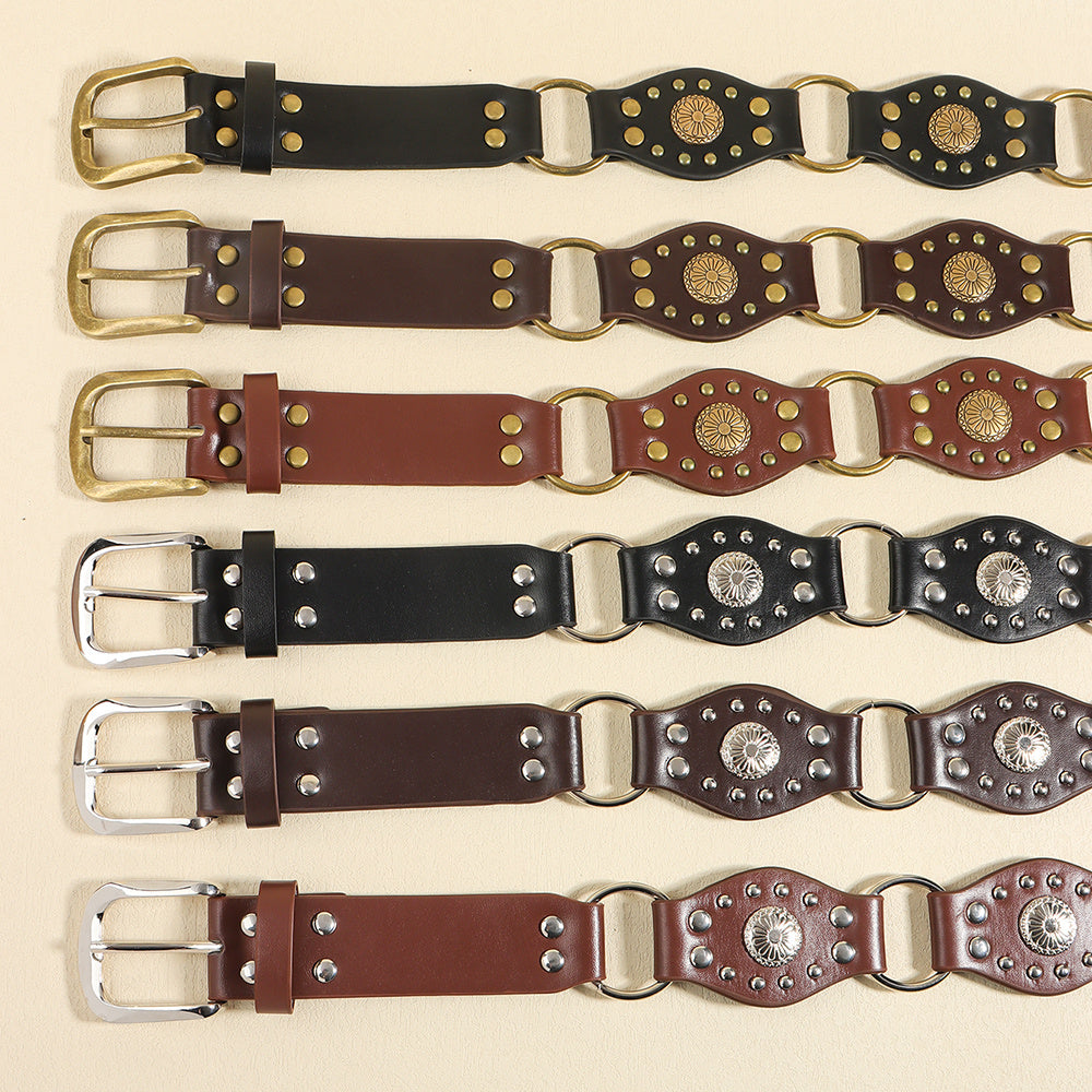 This vintage riveted metal buckle belt provides a stylish and durable option for any outfit. Made with high-quality materials, this belt offers a secure hold and adds a touch of sophistication to your wardrobe. With its timeless design, this belt is a versatile and functional accessory for any occasion.